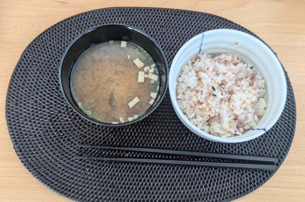 発酵雑穀ごはんの上にみそ汁を注ぎ、刻みねぎや海苔をトッピング。